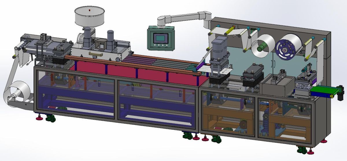 Принцип работы механизма: после того как пленка (ПВХ) нагрета и отформована, ячейки блистера наполняются материалом на рабочем столе. Затем заполненные ячейки подаются на станцию термосварки, где на их поверхность запаивается алюминиевая фольга.